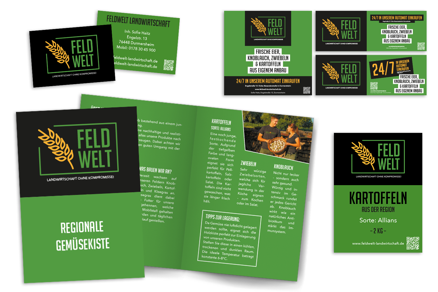 Feldwelt ist ein junges Landwirtschaft Start-Up. Dafür wurde der komplette Markenauftritt überarbeitet. Über Visitenkarten, Etiketten, Broschüren und vieles mehr.