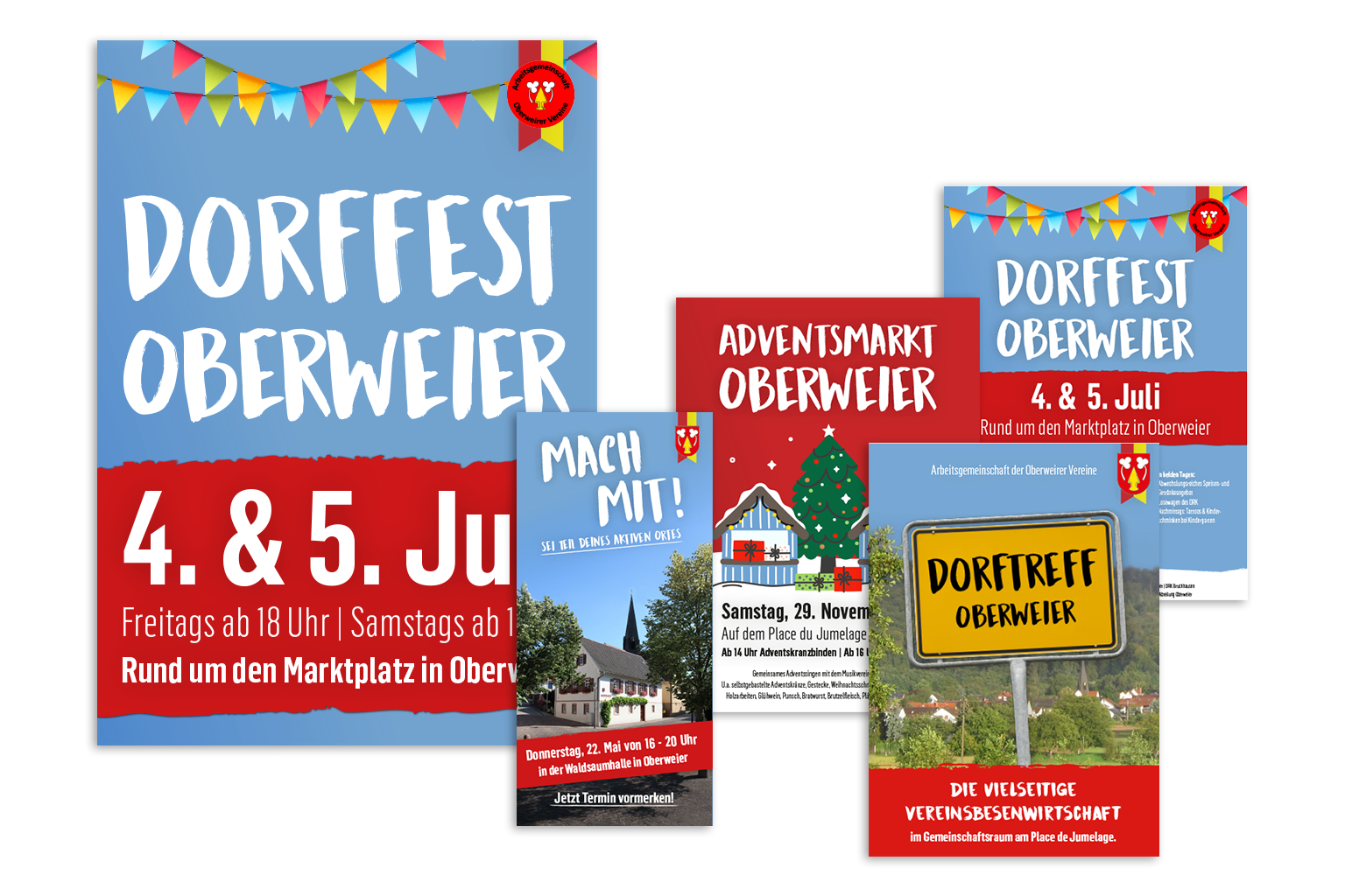 Für den Ort Oberweier gestalte ich reglmäßig Veranstaltungsmaterial wie z.B. Flyer & Plakate fürs Dorffest, den Dorftreff oder den Adventsmarkt.