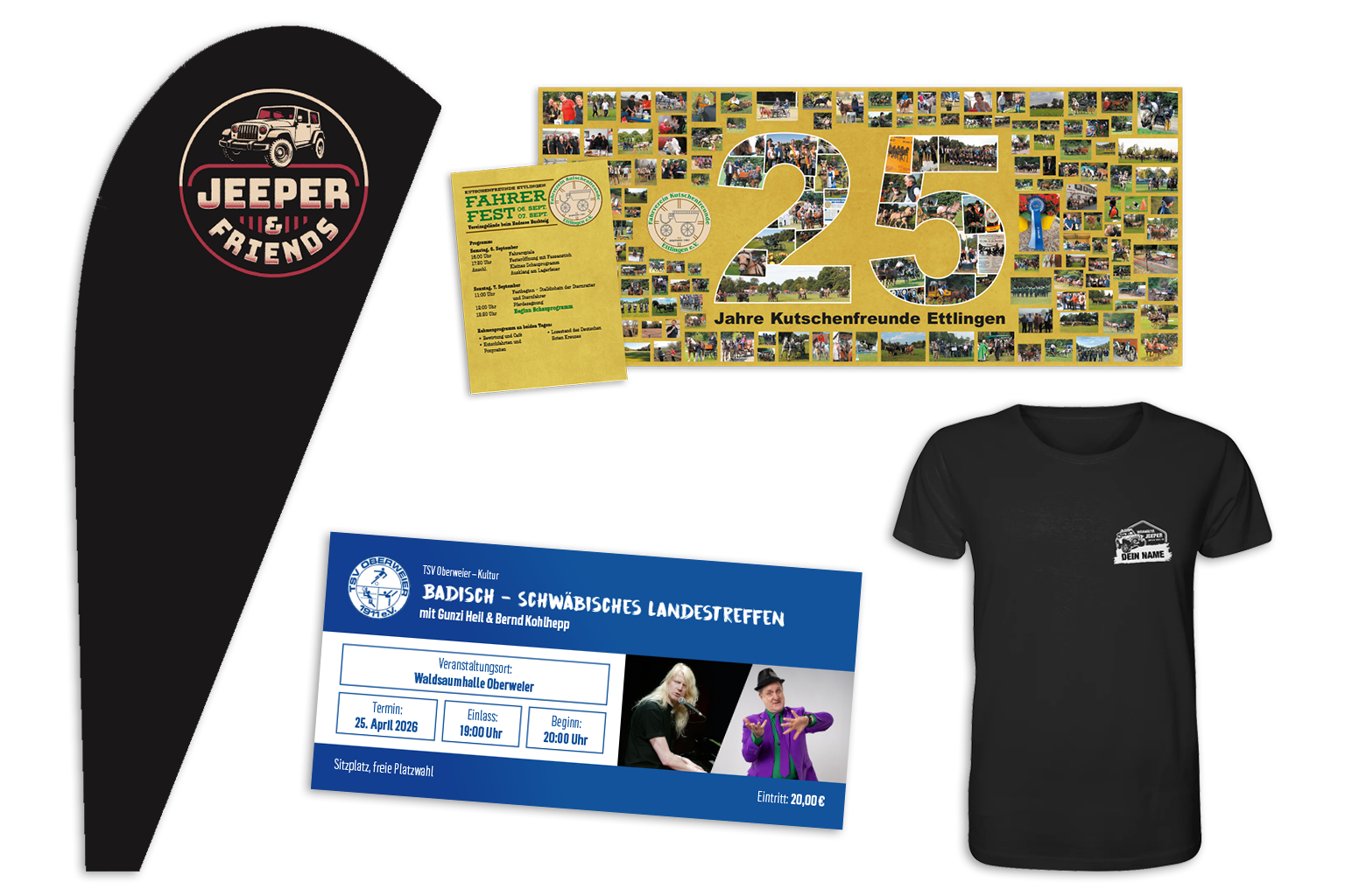 Beachflags, Banner, Plakate, Tickets oder auch personalisierte Shirts. Damit wird jedes Event zu einem Hingucker.