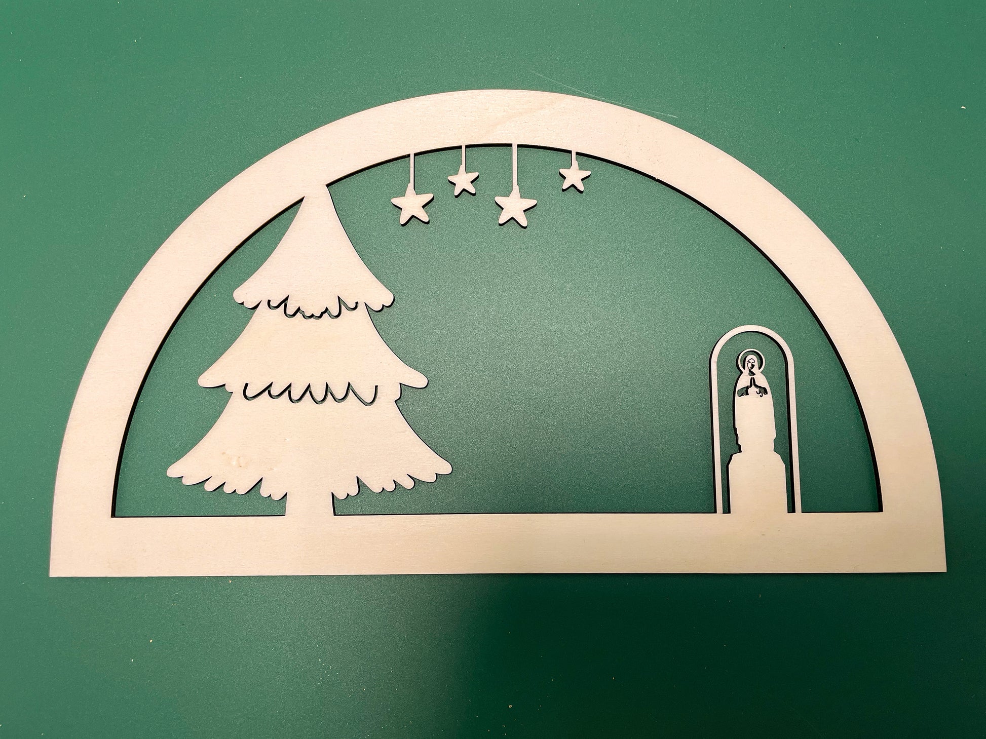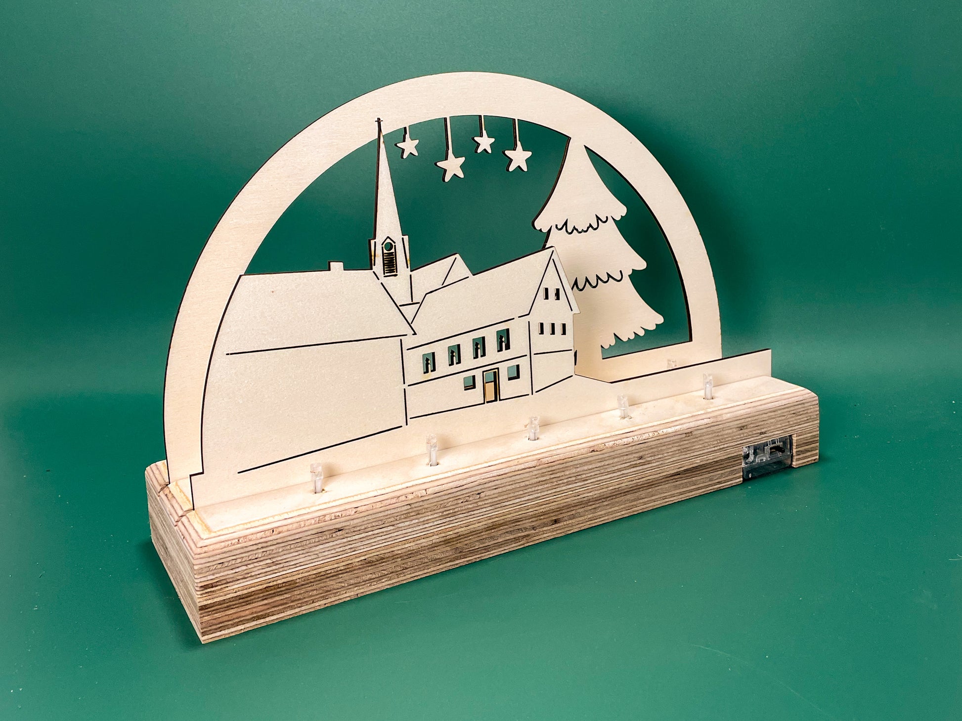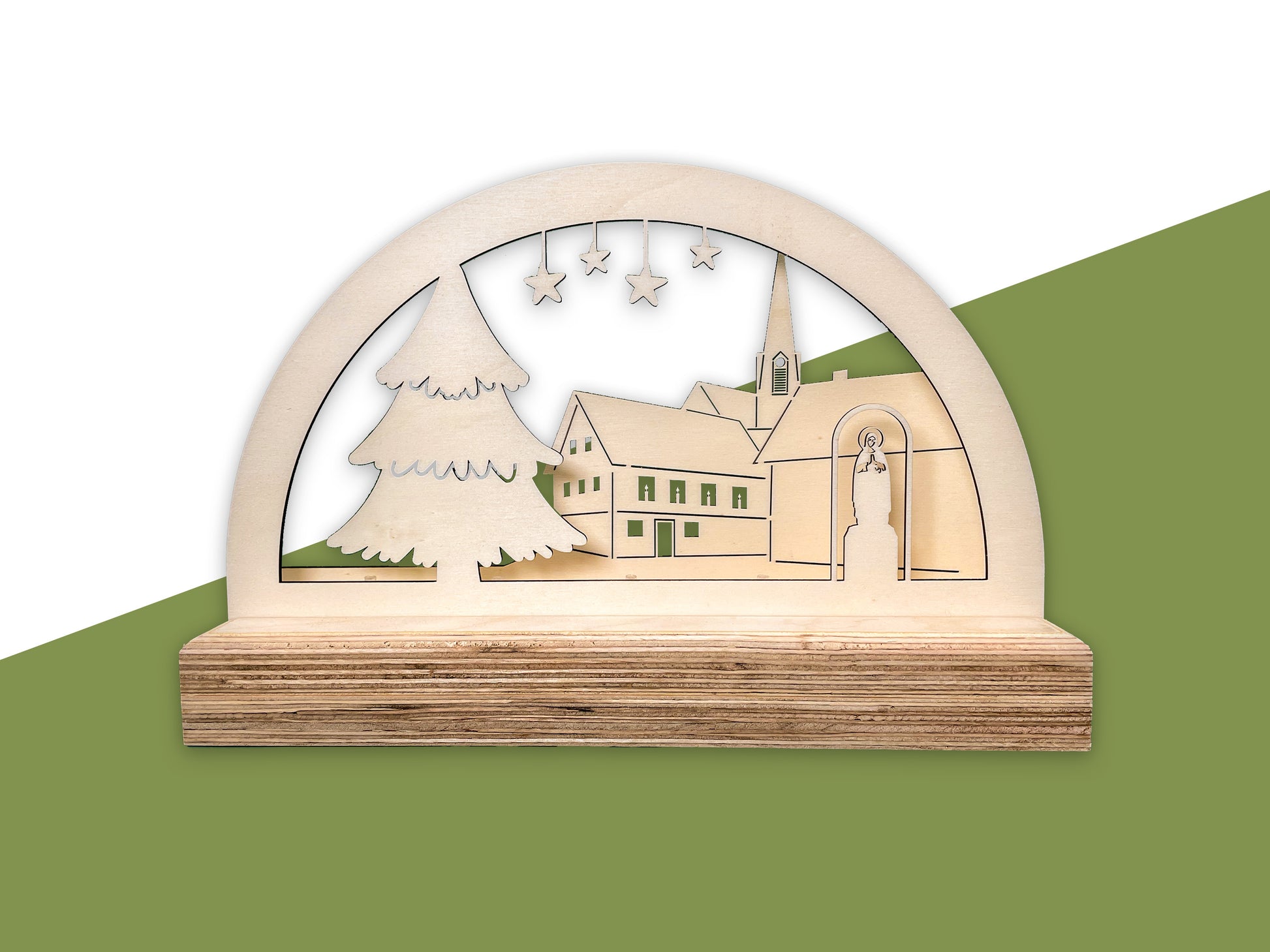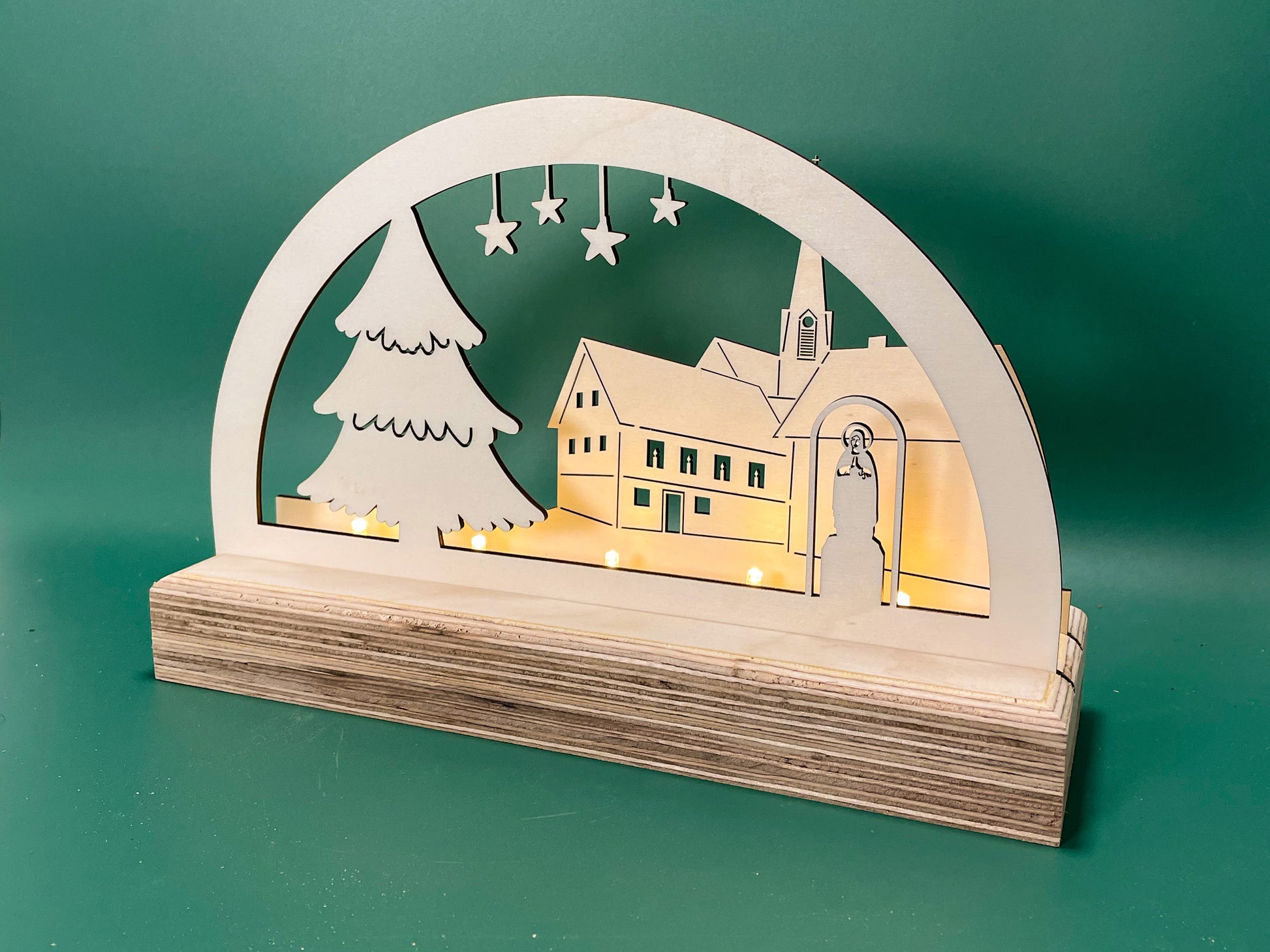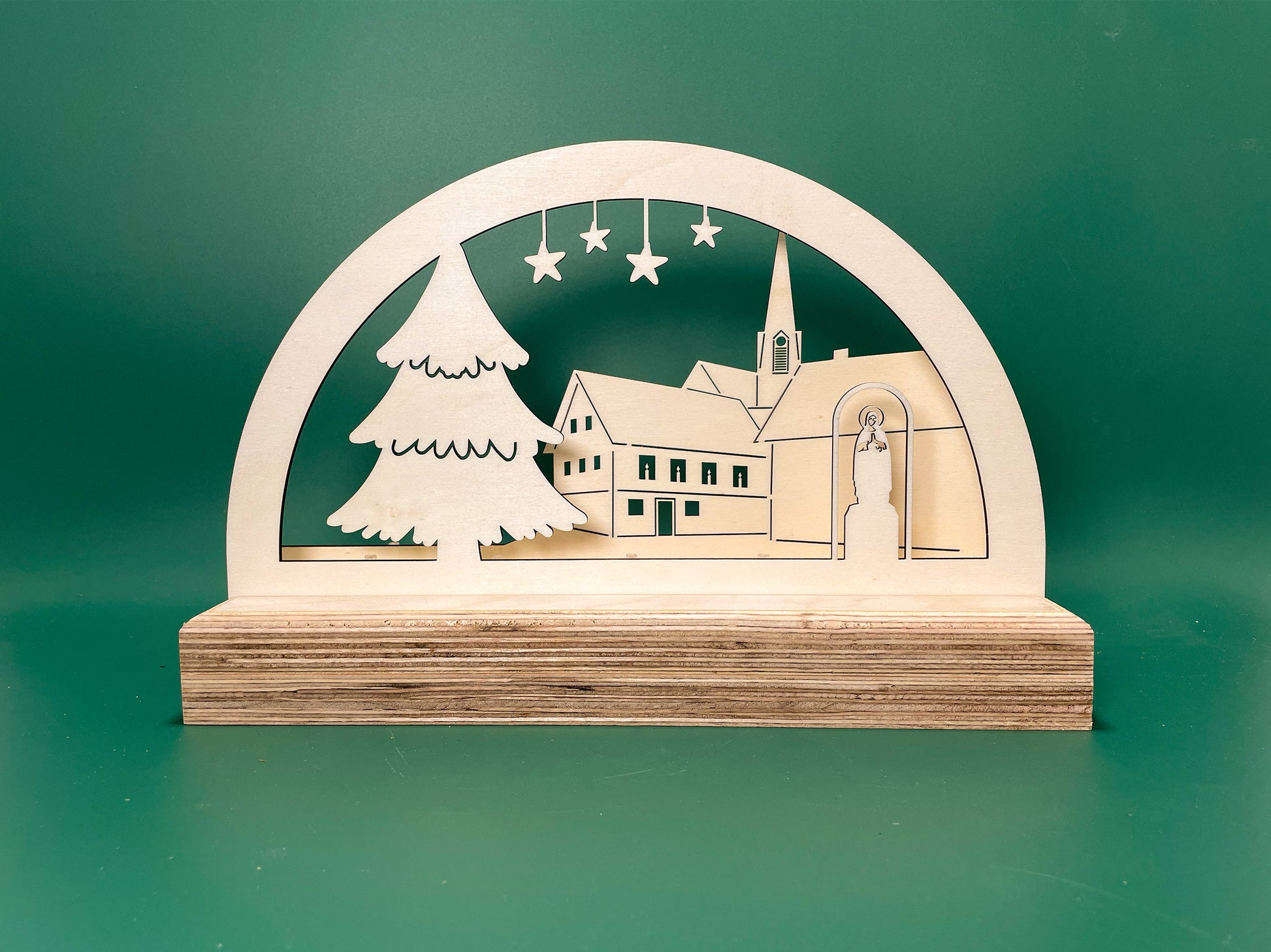 Bringe festlichen Glanz in dein Zuhause mit unserem liebevoll handgefertigten Schwibbogen aus hochwertigem Sperrholz und dem beleuchteten Sockel aus stabilem Multiplexholz. Dieses einzigartige Kunstwerk zeigt den weihnachtlich geschmückten Marktplatz von Ettlingen-Oberweier – inklusive Rathaus, Kirche St. Wendelin, funkelndem Sternenhimmel und großem Weihnachtsbaum.