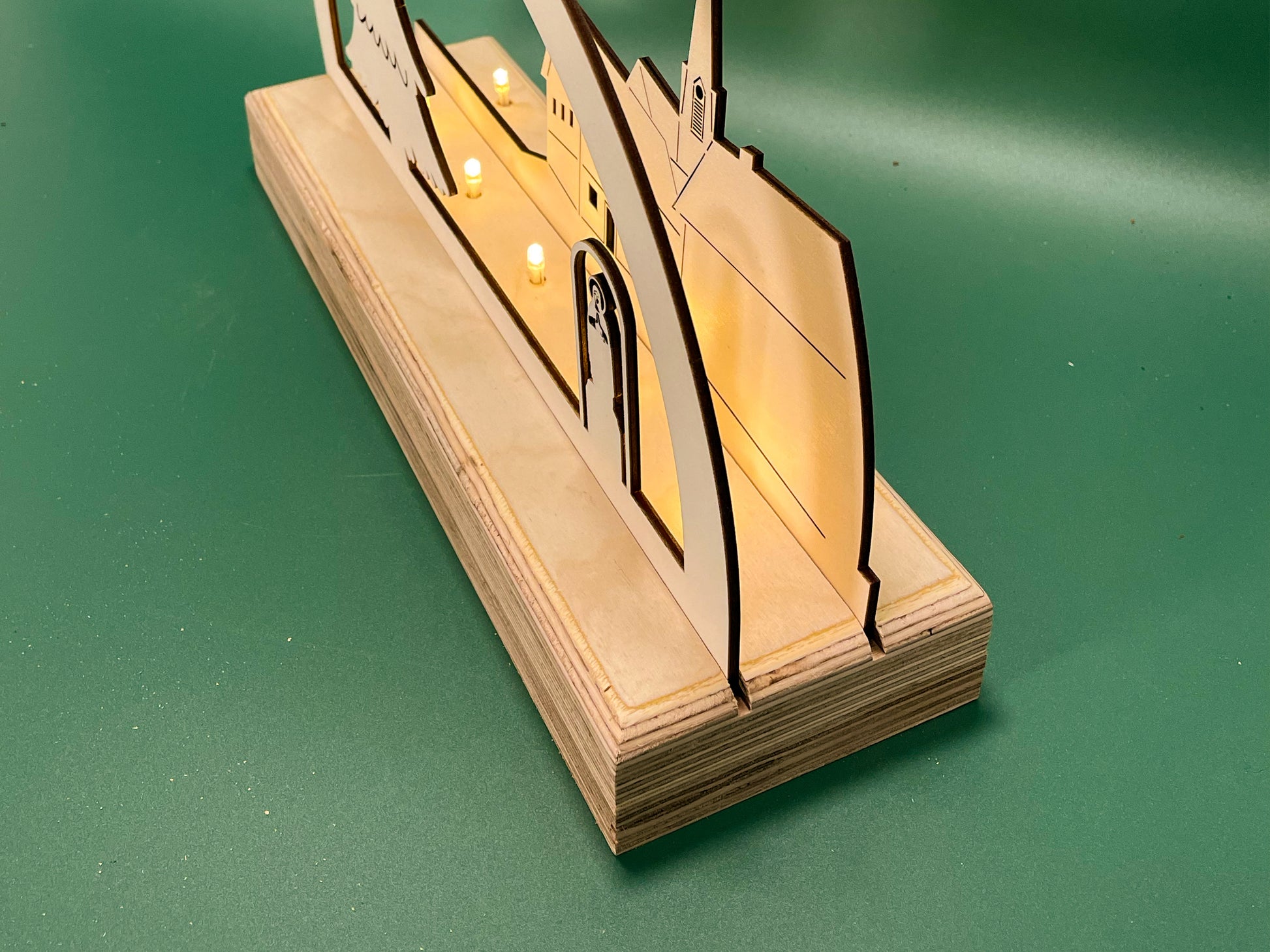 Der massive Sockel enthält 10 warmweiße LED-Birnchen, die das filigrane Motiv sanft erhellen und eine behagliche Weihnachtsatmosphäre schaffen. Dank Batteriebetrieb (keine Steckdose nötig) kannst du den Lichterbogen flexibel überall in deiner Wohnung aufstellen – ob auf dem Fensterbrett, dem Sideboard oder als Highlight im Wohnzimmer.