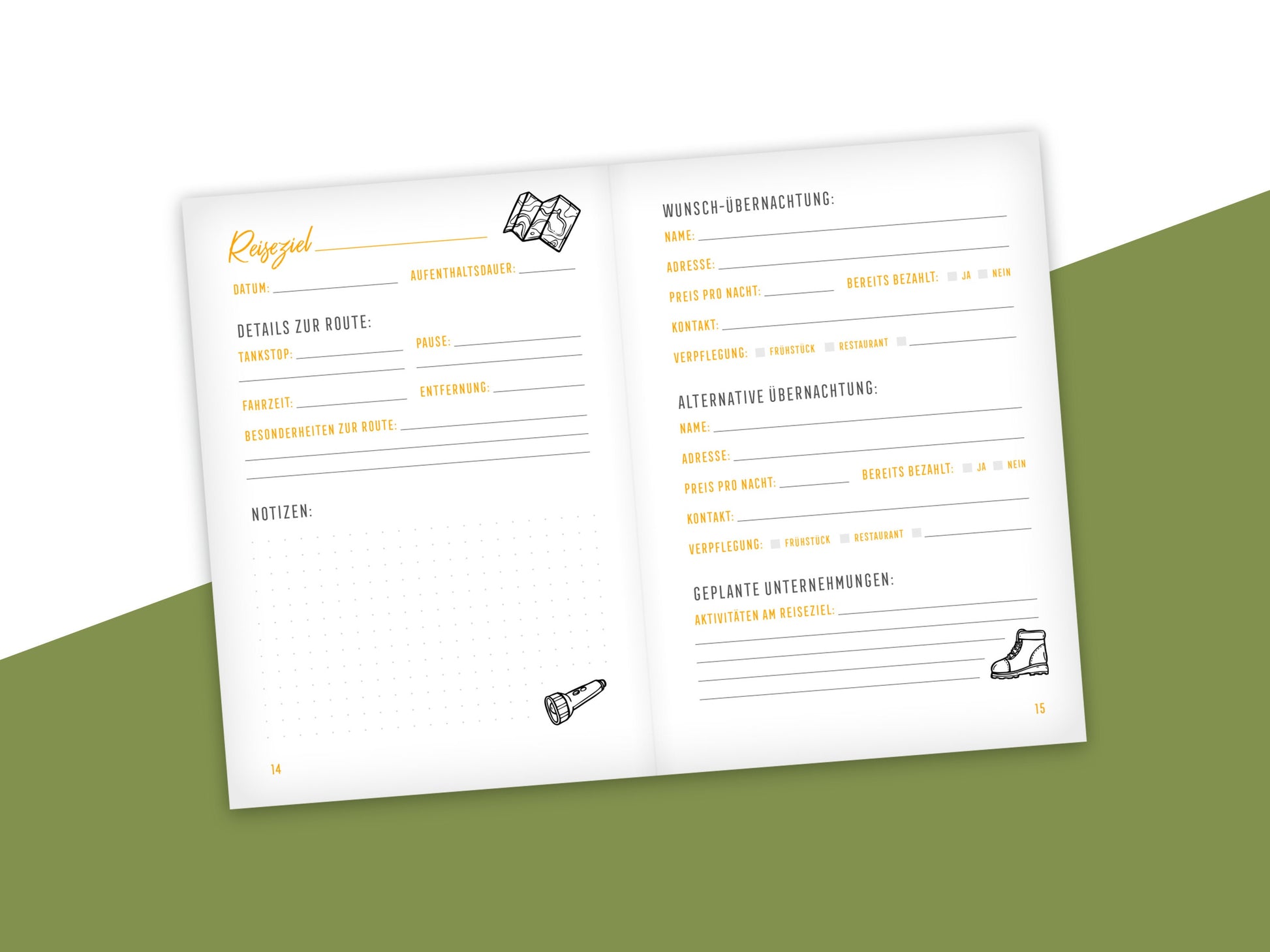 Nutze 42 Doppelseiten, um deine Stopps, Highlights, Routen und Übernachtungsmöglichkeiten festzuhalten – für unvergessliche Abenteuer.